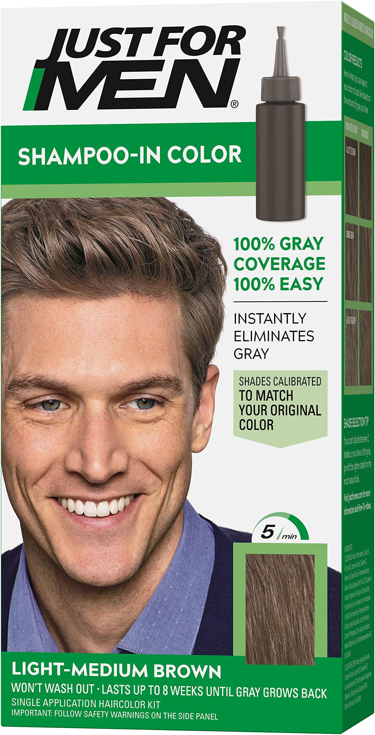 When in doubt, choose a shade one level lighter than your current hair color. Just For Men tends to run darker than expected. If you have medium brown hair, choose "Light-Medium Brown." You can always reapply for deeper coverage, but you can't easily undo dark color.