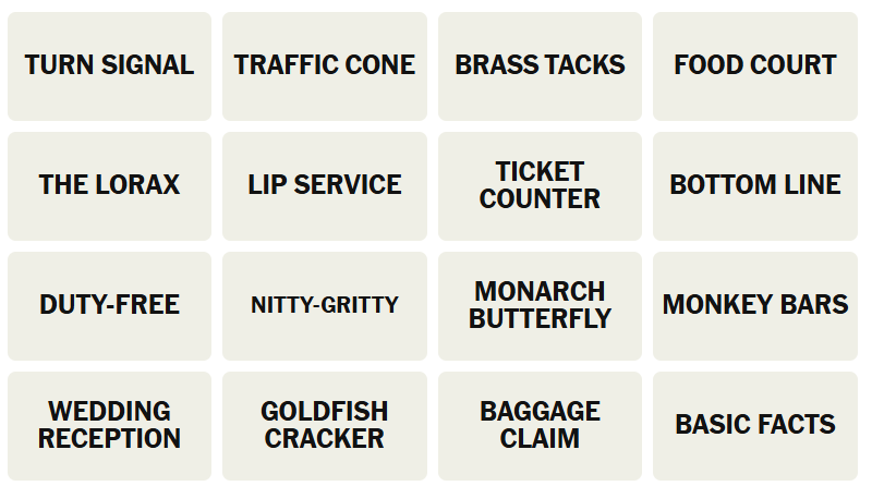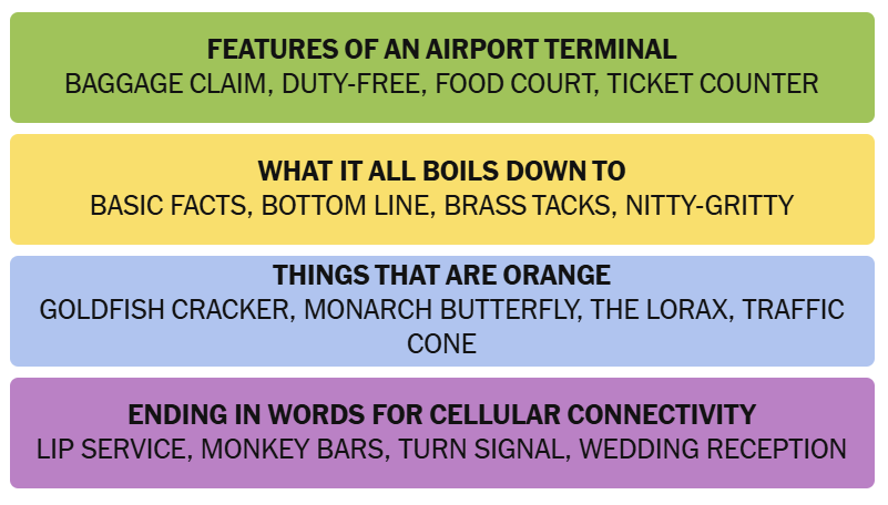 - Purple Category: This is the wordplay category. Think about a common word that can follow each of these terms to create a compound phrase.